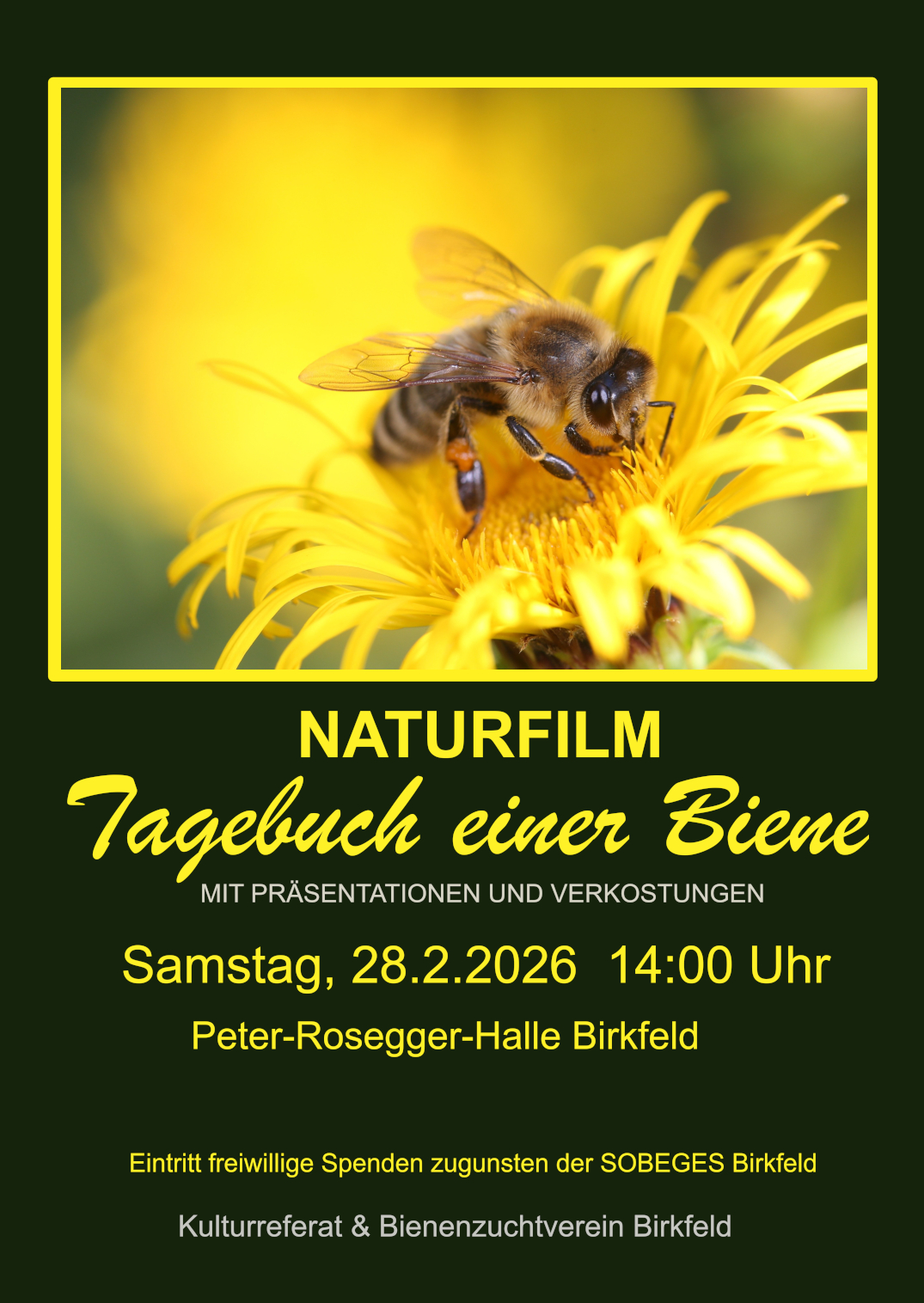 Der Naturfilm "Tagebuch einer Biene" beschreibt eindrucksvoll das wahre Leben der Bienen mit spektakulären Nahaufnahmen und Naturbildern. Viele spannende Details machen diesen Film zu einem Erlebins für die ganze Familie. Aus der ursprünglichen Idee, für diesen Film ein Kino im kleinen Rahmen zu buchen, wurde Dank der Sponsoren ein Event mit sechs Kinovorstellungenen. . |